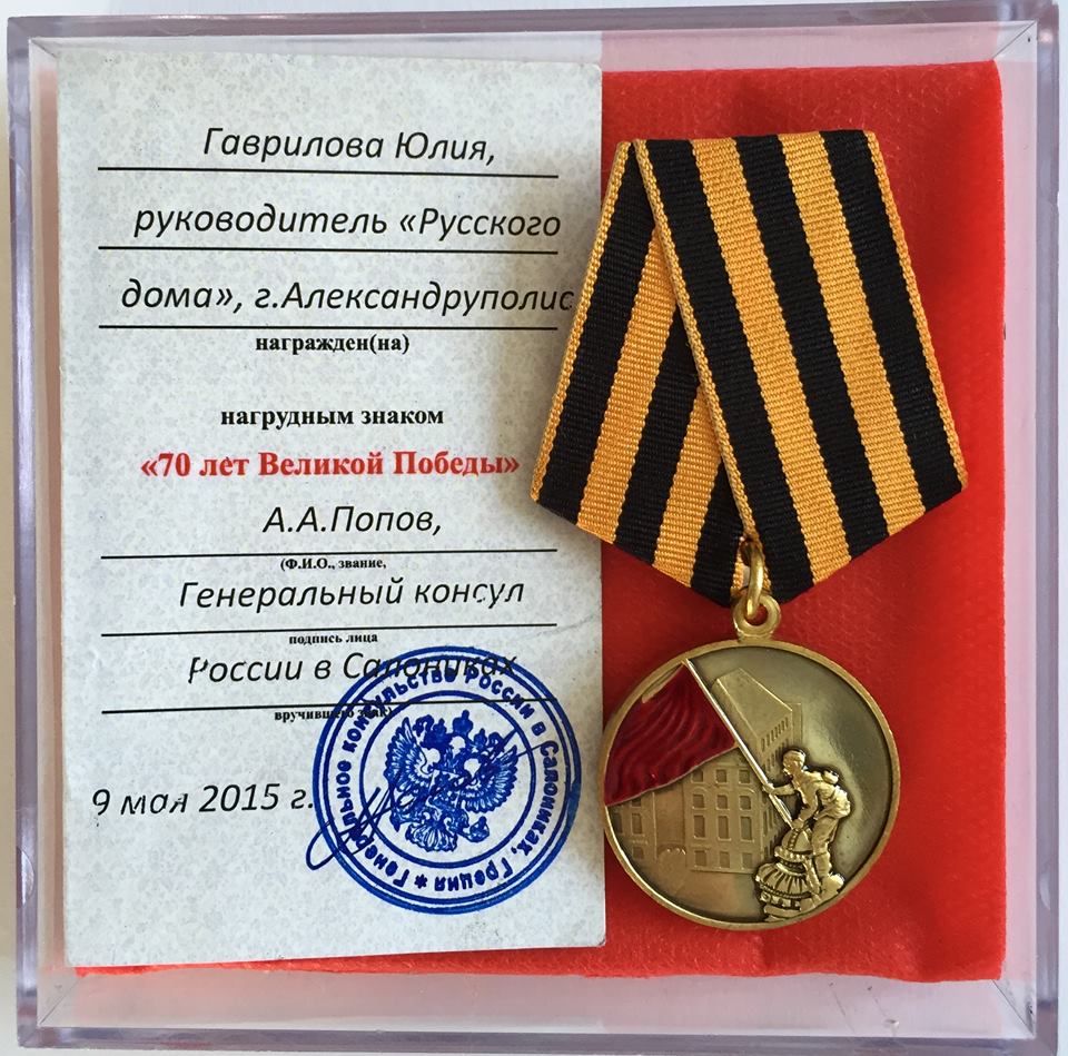 24 мая от Совета Федерации РФ, Генеральный консул РФ в Греции Алексей Анатольевич Попов, за проявленную активность в проведении ряда мероприятий, посвященных празднованию 70-летия Победы в Великой Отечественной Войне, а также за участие в памятных мероприятиях в Санкт-Петербурге по приглашению правительства С-Пб, награждена памятной медалью «70 лет Великой Победы» руководитель организации «Русский Дом» в Греции Гаврилова Ю.В. пресс-центр Русского Дома в Греции